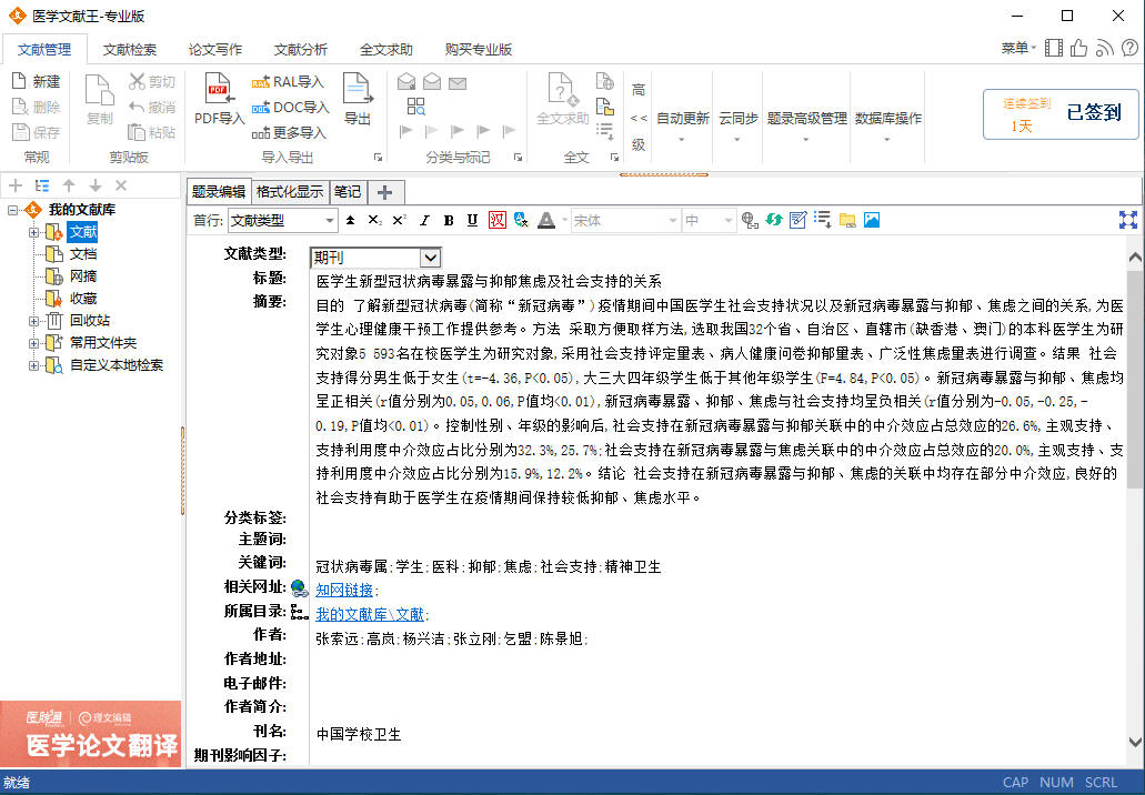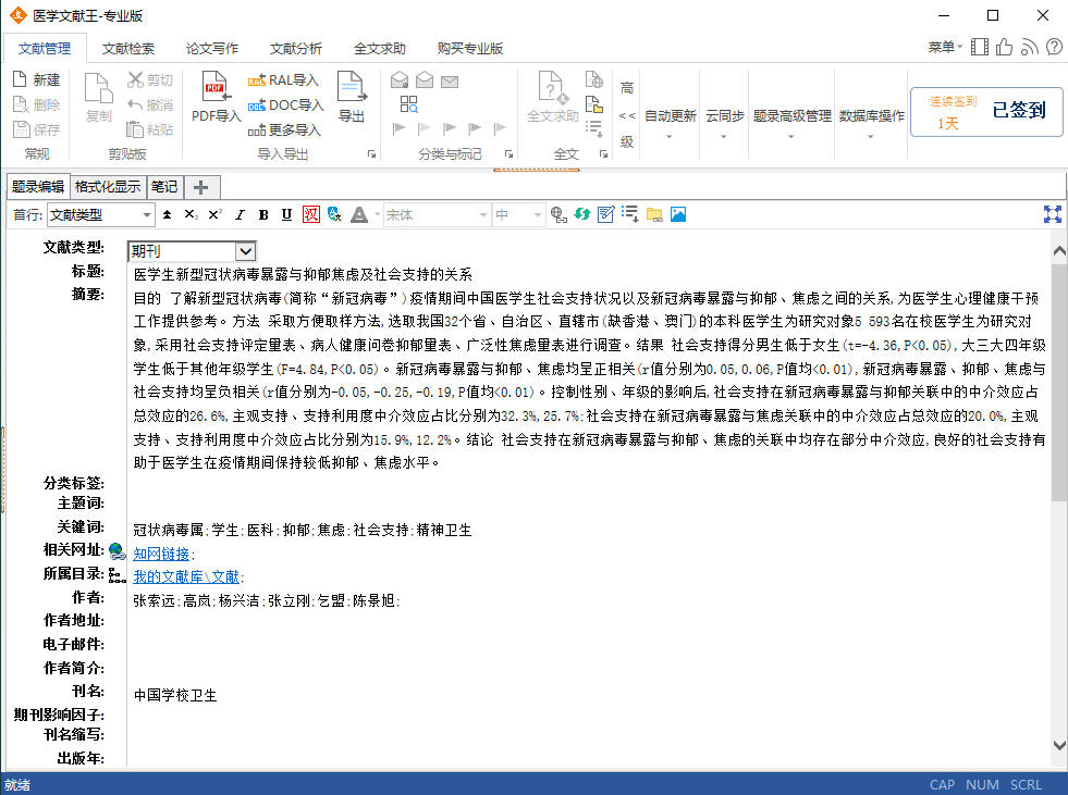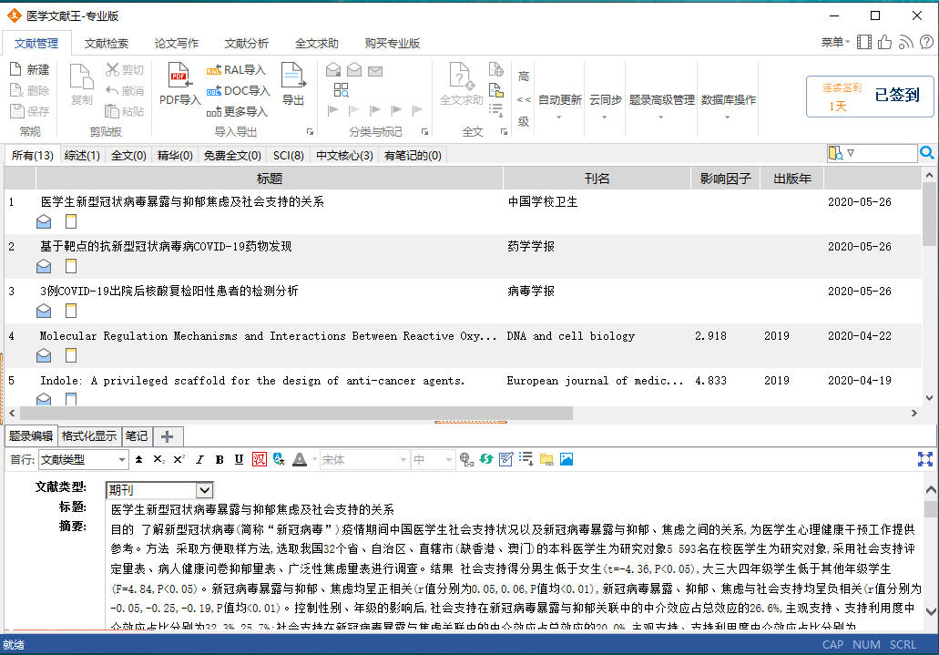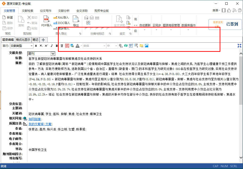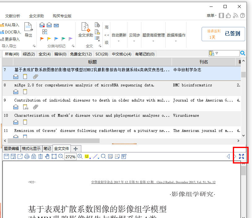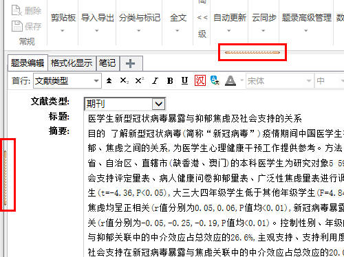 按一下,就隐藏了文献列表界面以及橙色条,以提供更多的空间来显示文献详情界面,这在阅读文献全文时就比较有用。而要恢复文献列表就很简单了,再点一下这个“缩放显示”按钮就行了。