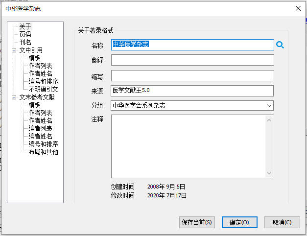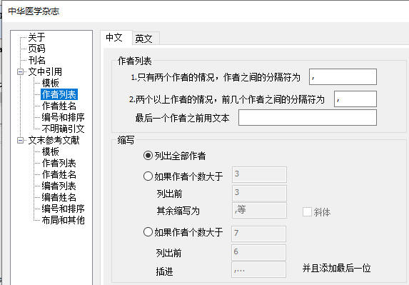 “作者列表”和“作者姓名”这两部内容都是针对出版年制的著录格式,可以根据需要调整。另外还要注意,“作者列表”部分对中文和英文文献需要分别设置。因为出版年制的著录格式现在使用不多,就不详述;需要设置的话也比较简单。