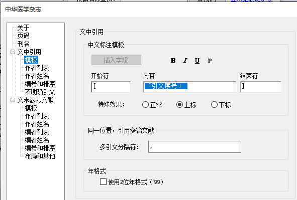 这里主要是用来规定文中引用的显示内容,修改较多的是引文序号的“开始符”和“结束符”。有的稿约要求只显示数字序号就行,那么这里只要删除开始符和结束符就行了。
