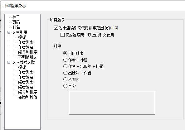 对于顺序编码的著录格式,排序的调整没什么意义,不用调整;出版年制的著录格式可以根据要求作相应调整。连续编号使用范围仅针对顺序编码的著录格式,可以根据要求调整是否使用数字范围,以及是否需要连续3个才使用。调整都比较简单,不赘述了。