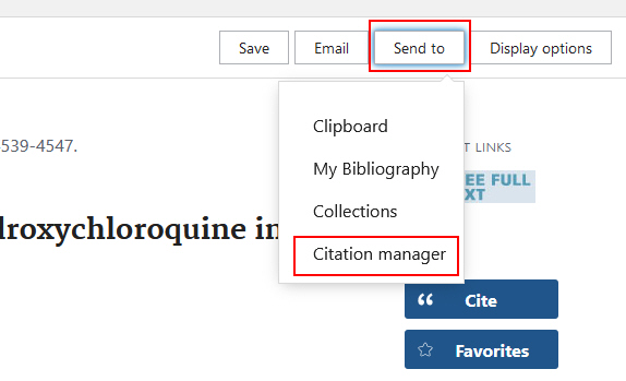 打开官网后,输入关键词搜索,点开需要导入的文献。点“Send to”,选择“Citation manager”