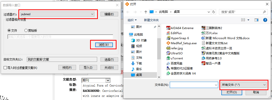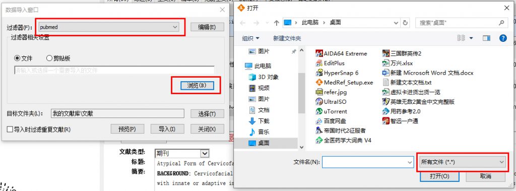 在打开的导入界面,过滤器选择“pubmed”,然后点“浏览”按钮,选中上面下载的文献(nbib扩展名)。如果找不到下载的文献,在文件类型里面选择“所有文件*.*”。选择文献导入的目录,然后点导入即可将所需文献导入文献王了。